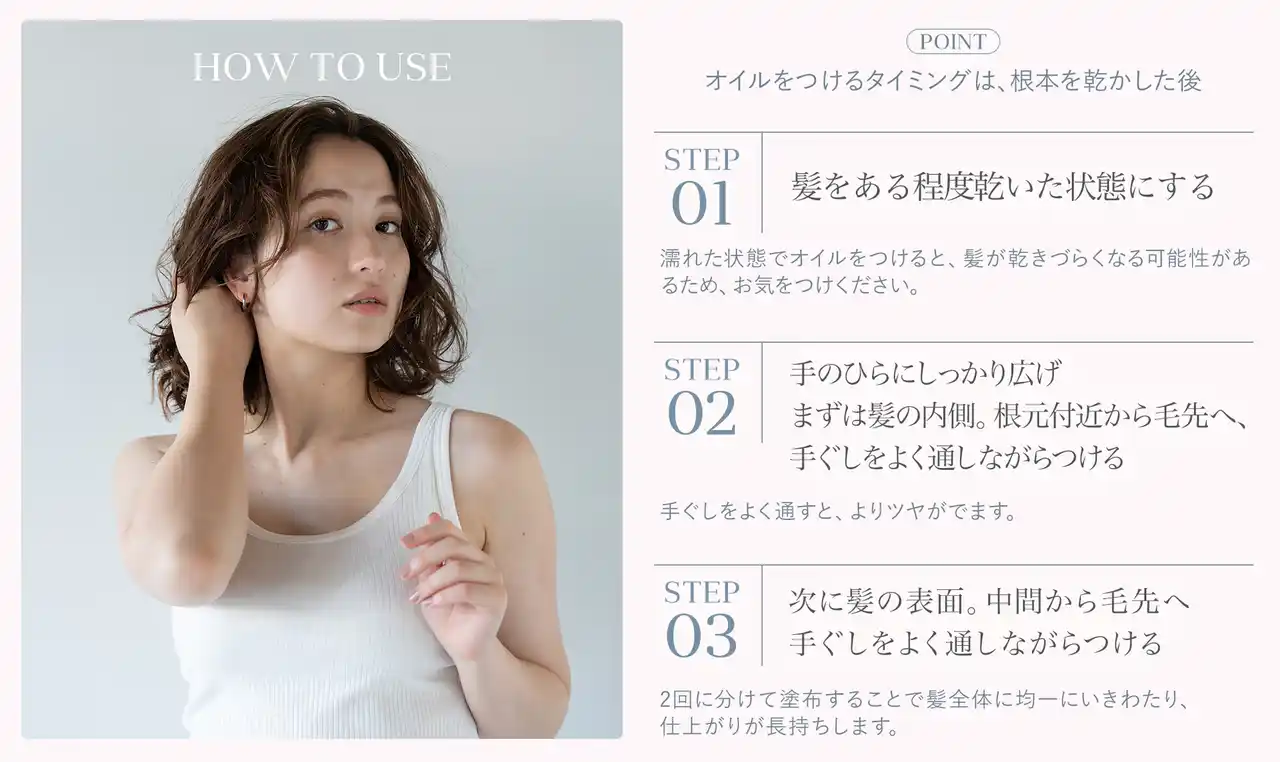 うねり・広がり・パサつきに寄り添うマルチオイルです。 |