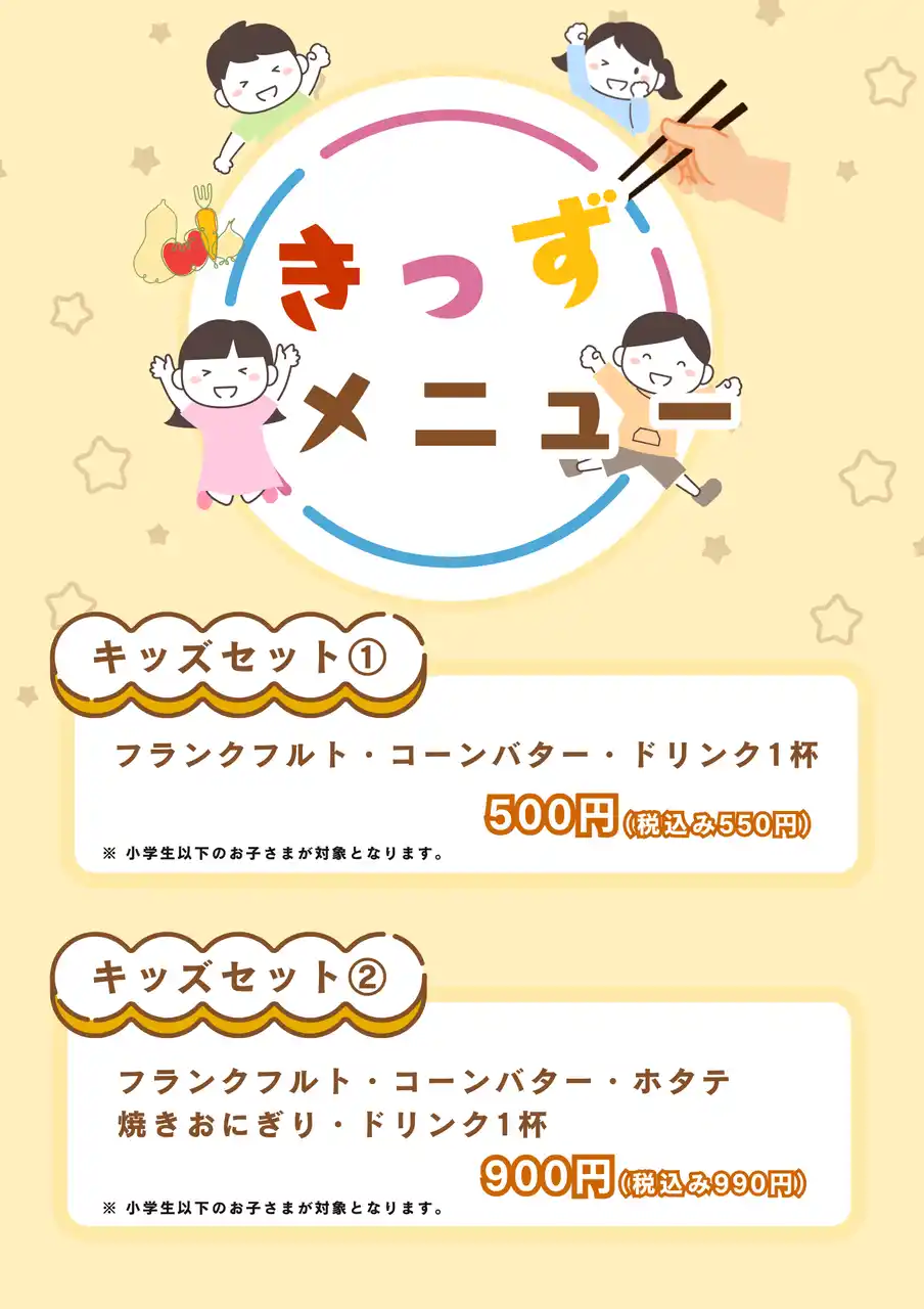 「家族みんなで牡蠣小屋を楽しんでほしい」 そんな想いから、「牡蠣小屋 かき太鼓」ではお子さまにも嬉しいキッズメニューをご用意しました。 |