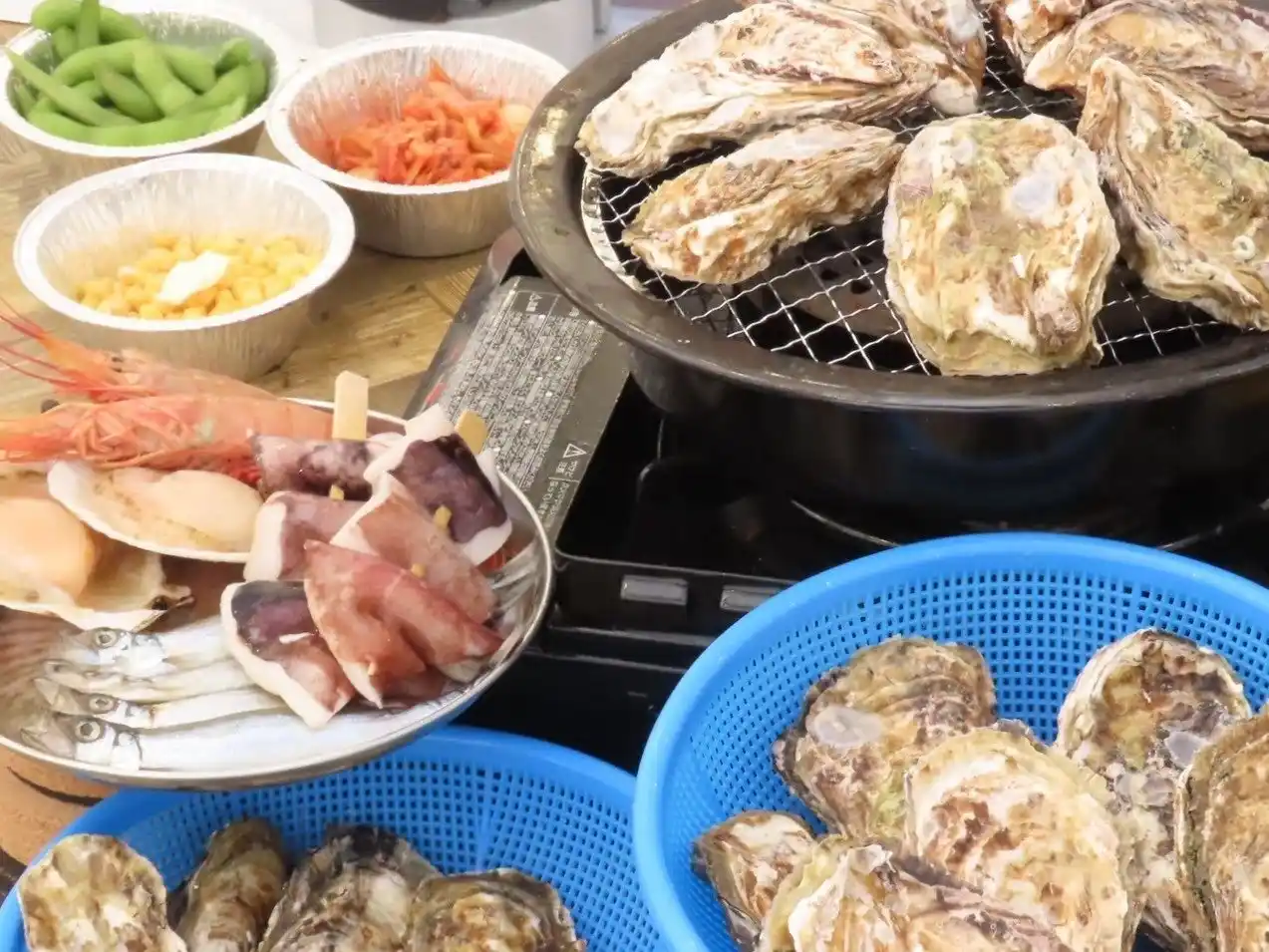 牡蠣食べ放題(焼き・蒸し)+ 焼きおにぎりセット 大人(中学生以上):税抜 3,900円(税込 4,290円) 小学生以下:税抜 1,955円(税込 2,150円) |