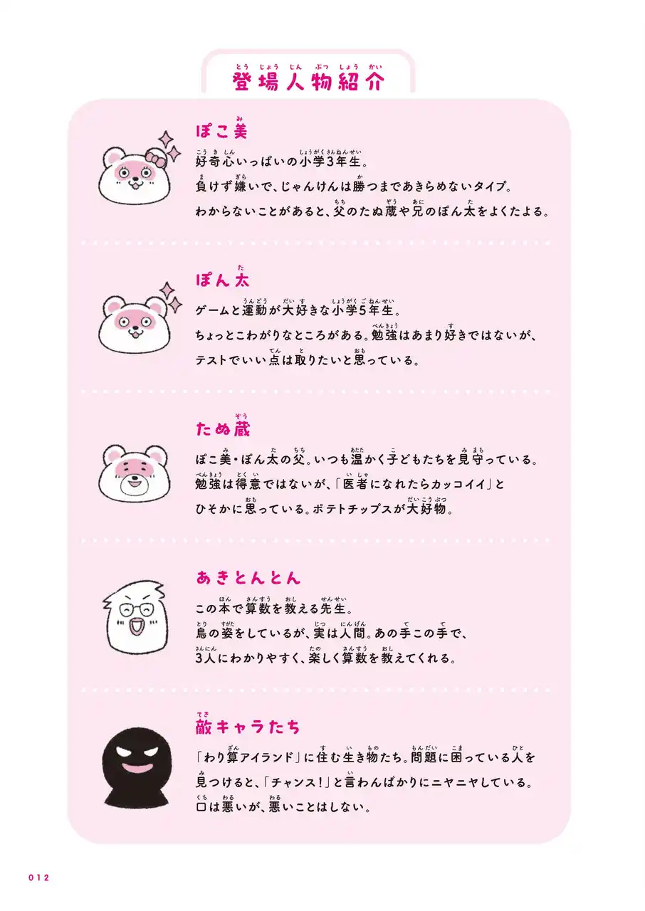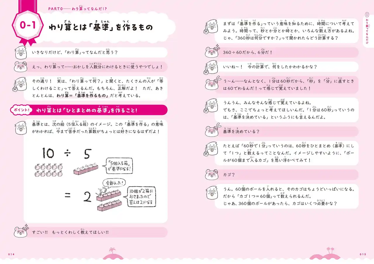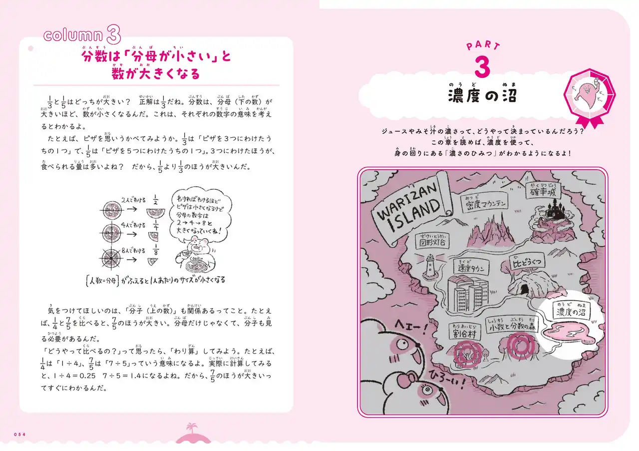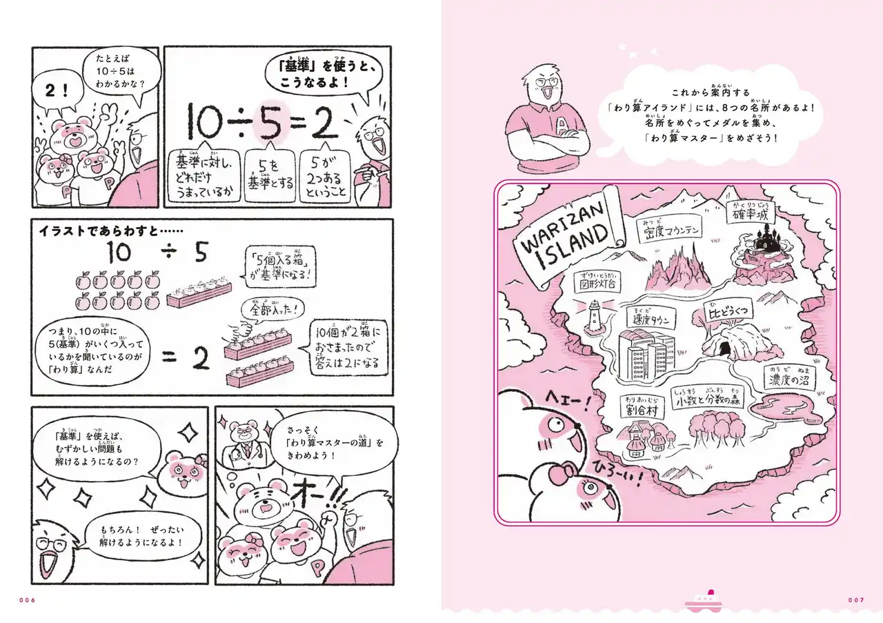 | 本書の中では、あきとんとん氏が鳥の姿をした先生となって登場。ぽこ美、ぽん太兄妹とともに、読者を「わり算アイランド」への冒険に誘います。「割合村」「小数と分数の森」「密度マウンテン」など、テーマごとに分かれた8つの名所を巡ってメダルを集めることで、算数の重要概念が自然と身につく構成となっています。キャラクターたちの対話形式で展開していくので、ゲームを攻略するような感覚で、楽しく、飽きることなく読み進めることができるのも本書ならではの特長です。 | |||||||