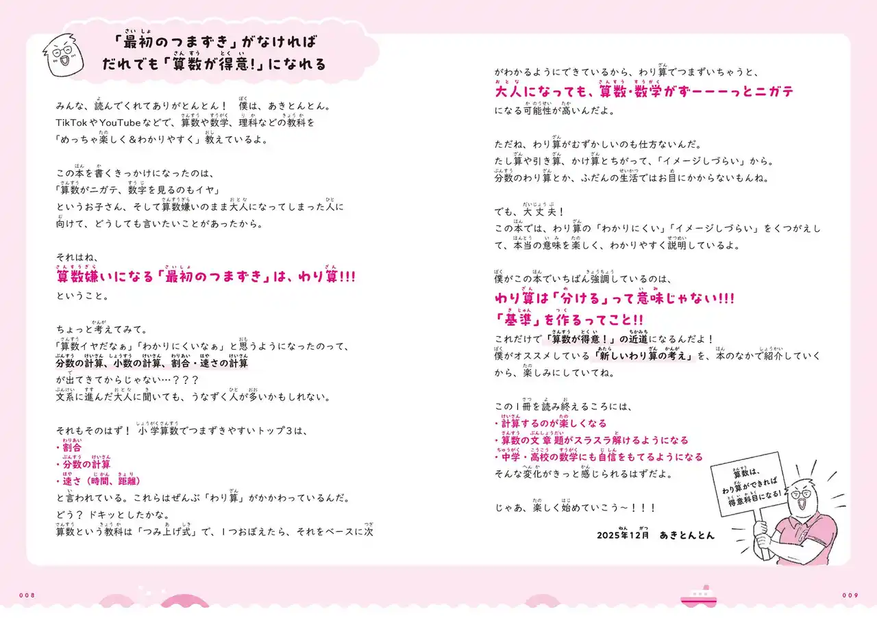 | 本書は「算数・数学・理科をめっちゃ楽しく&わかりやすく」教えるスタイルで、多くの視聴者の支持を集め、TikTok Awards Japan 2024を受賞したプロ算数YouTuber、あきとんとん氏が長年の教育経験から導き出した、算数嫌いを克服して得意科目に変えてしまう夢のような一冊です。 | |||||||