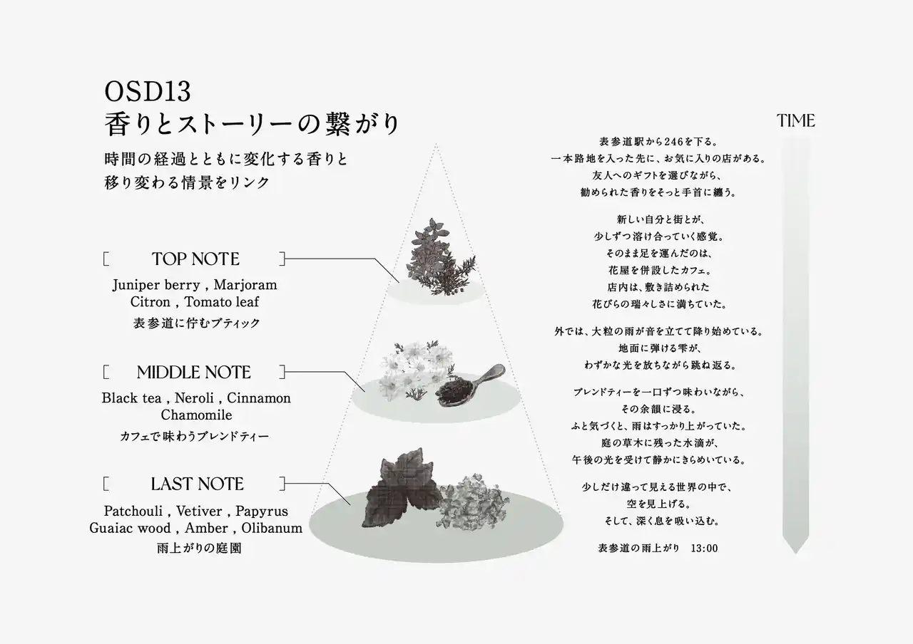 OSD13 は、表参道の13時に広がる、何気ないワンシーンを切り取った香りです。 買い物を楽しんだあと、ふと立ち寄ったカフェでひと息。 その休憩の合間に降り出した雨が、外の空気をほんの少しだけ変えていく―― そんな“ささやかな変化”を捉えた、#イプシス らしい繊細さで表現しました。 気分や日常に寄り添う、あなただけの"OSD13"をあなたらしく。 【STORY】 表参道駅から246を下る。 一本路地を入った先に、お気に入りの店がある。 友人へのギフトを選びながら、勧められた香りをそっと手首に纏う。 新しい自分と街とが、少しずつ溶け合っていく感覚。 そのまま足を運んだのは、花屋を併設したカフェ。 店内は、敷き詰められた花びらの瑞々しさに満ちていた。 外では、大粒の雨が音を立てて降り始めている。 地面に弾ける雫が、わずかな光を放ちながら跳ね返る。 ブレンドティーを一口ずつ味わいながら、その余韻に浸る。 ふと気づくと、雨はすっかり上がっていた。 庭の草木に残った水滴が、午後の光を受けて静かにきらめいている。 少しだけ違って見える世界の中で、空を見上げる。 そして、深く息を吸い込む。 表参道の雨上がり 13:00 【NOTE】 [TOP] 表参道に佇むブティック Juniper berry , Marjoram , Citron , Tomato leaf [MIDDLE] カフェで味わうブレンドティー Black tea , Neroli , Cinnamon , Chamomile カフェで味わうブレンドティー [LAST] 雨上がりの庭園 Patchouli , Vetiver , Papyrus , Guaiac wood , Amber , Olibanum |