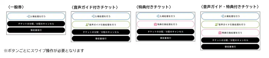 音声ガイド引換や特典引換の処理もスワイプ操作で完了します。処理が複数ある場合は、ボタンごとにスワイプ操作を行います。 |