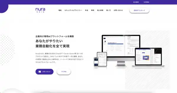 NuraGridは、複数の生成AI(ChatGPT、Claude、Gemini、Perplexity、DeepSeek、Grok、GPT-5.2等)を1つのアカウントで統合し、RAG、Tool、MCPで外部データと連携。企業の業務に最適化された専用AIを、ノーコードで即日作成できるビジネスAIプラットフォームです。