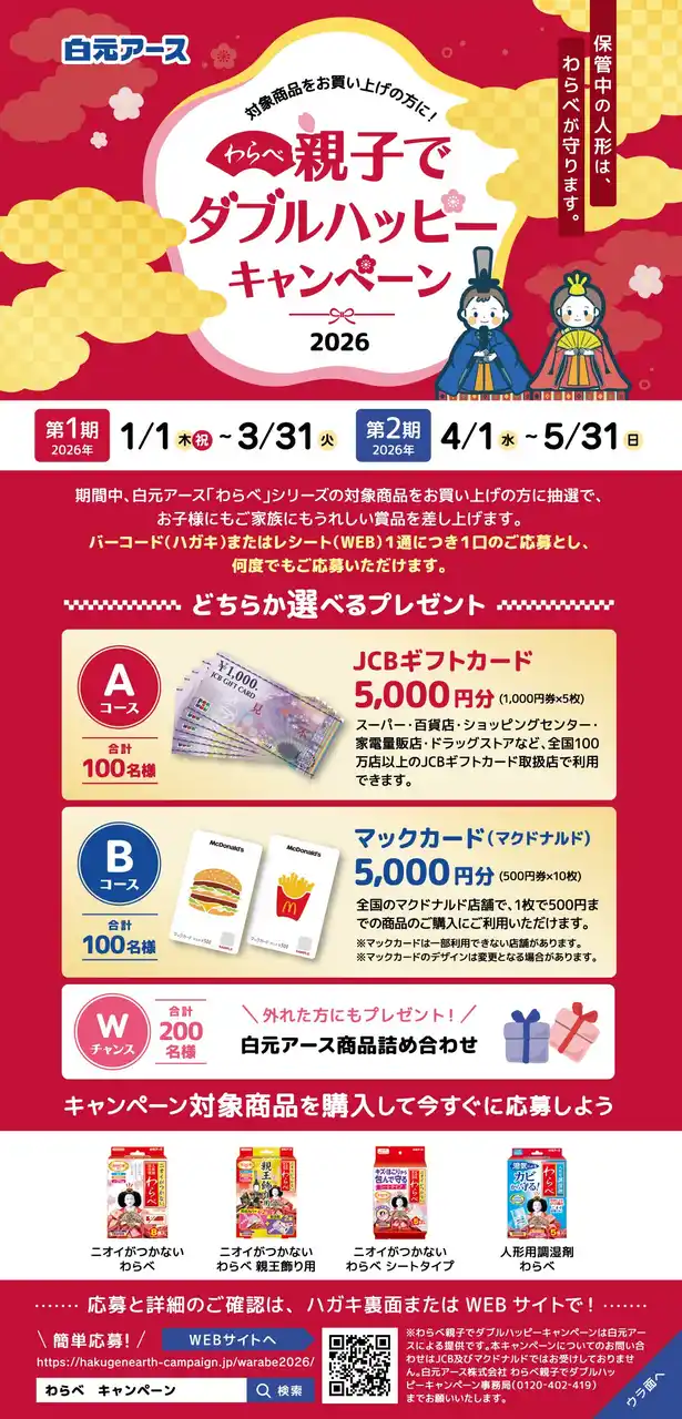 | 白元アース株式会社(本社:東京都足立区、社長:吉村一人)は、同社の人形用ケア商品「わらべ」シリーズを購入し応募いただくと、抽選で「JCBギフトカード5,000円分」や「マックカード(マクドナルド)5,000円分」が当たる『わらべ 親子でダブルハッピーキャンペーン2026』を2026年1月1日から実施いたします。 | |||