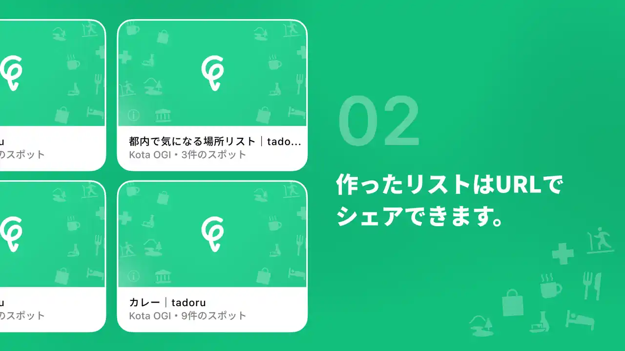 tadoruは、お気に入りのスポットをテーマごとにまとめ、音楽のプレイリストのように作成・共有・保存できるiOSアプリであり、信頼できる情報をもっと簡単に共有し合うためのツールです。 |