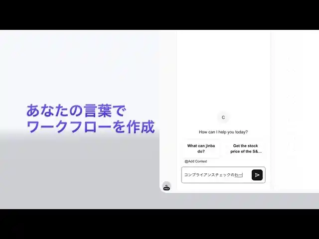 Jinbaはチャットで指示をするだけで、AIが自動的にワークフローを生成できるため、専門人材はもちろん、専門知識を持たない方でも簡単に、カスタマイズ型の業務効率化用のAIワークフロー、AIエージェントの構築が可能です。