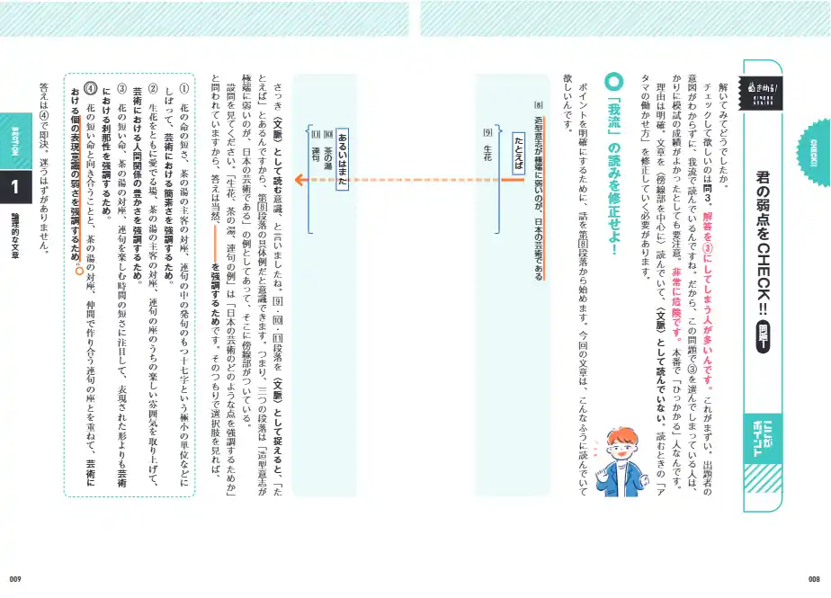 | 本書は、まずは、弱点をしっかりあぶり出すところからスタートし、効率よくトレーニングできる構成になっています。Section1「論理的な文章」と Section2「文学的な文章」の冒頭には、それぞれ読解力をチェックする問題を用意。最初に自分の弱点を把握することで、的確に学習を進められます。 | |||||||
