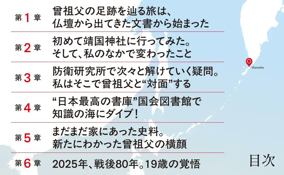 調べていくと、曾祖父は「占守島の戦い」に、停戦交渉軍使のロシア語通訳として随行し、戦死していたことを知るのでした。“終戦”3日後にそんな戦いがあったのか。19歳の情報系高専生が、あらゆる方法で自分のルーツを探すなかでわかった、占守島の戦いのこと、そして戦争、平和、家族愛について、等身大の思いを綴ります。 |
