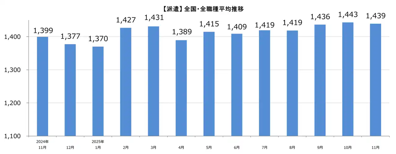 【派遣】全国・全職種平均時給は1,439円。前月比-4円。前年同月比+40円。 |