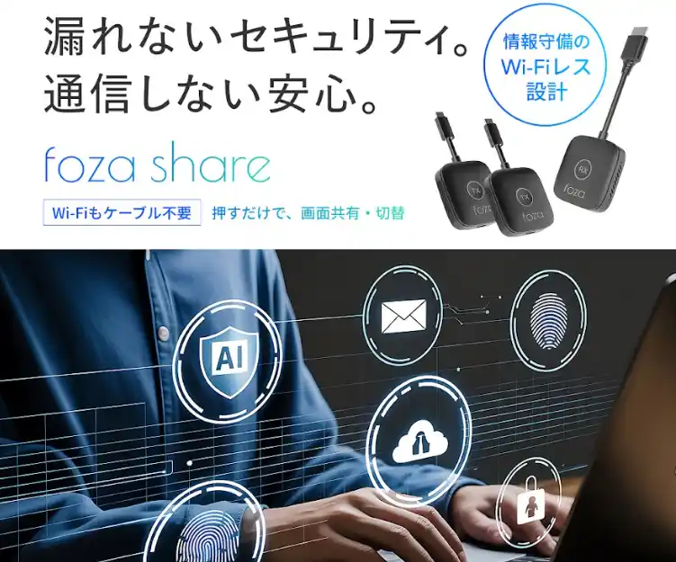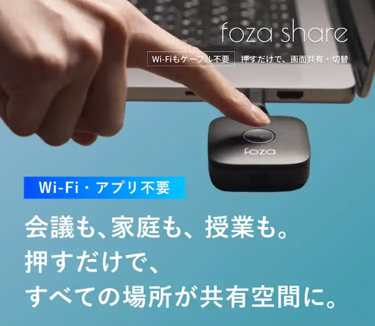 『foza share』は、複雑な設定やアプリのインストールを一切必要としない、次世代の画面共有スマートデバイスです。 |