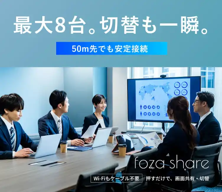 「誰でも・すぐに・迷わず画面共有できる」という革新的な操作性を実現した『foza share』は、ボタンひとつで瞬時に大画面共有が可能。最大8台までの同時接続に対応し、会議やプレゼンの切り替えを驚くほどスムーズにします。煩雑な設定や操作ストレスから解放される新しい共有体験が、ビジネスシーンをはじめ、教育現場、ご家庭まで幅広い層から高い評価をいただいています。 |