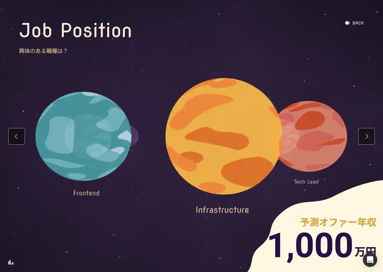 | デザインコンセプトには「宇宙探査」を採用しました。未知の領域(新しいキャリア)へ飛び出すワクワク感を演出し、ゲーム感覚で没入感のある体験を提供します。 | ||||||||||||