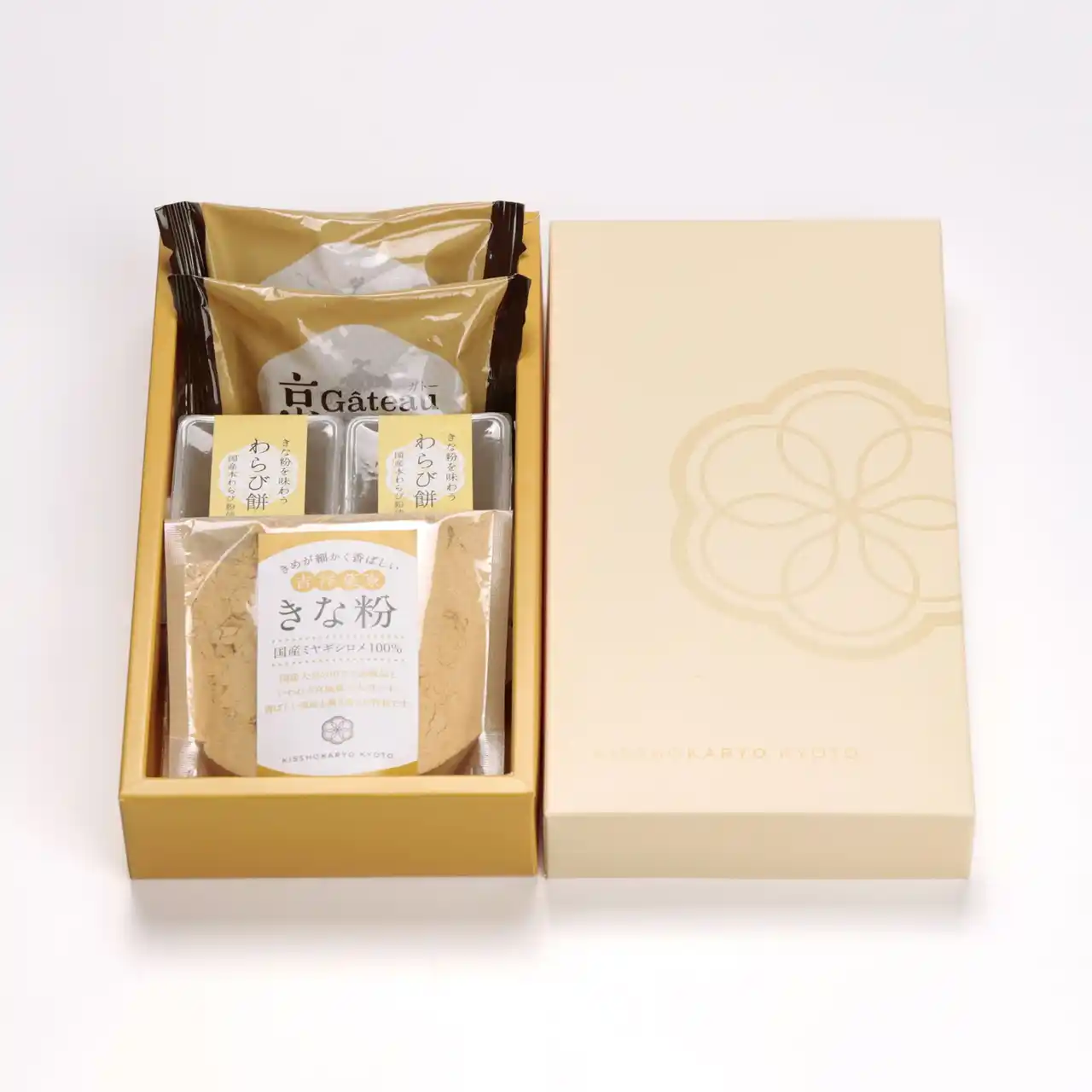 吉祥菓寮で深み焙煎したこだわりのきな粉を、まずは気軽に楽しんでいただけるよう、香り高い「京挽ききな粉」50gに、とろける食感が人気の「京都はんなりわらび餅」2個、きな粉の余韻が心地よい「京Gateauきな粉」2個を詰め合わせました。 |