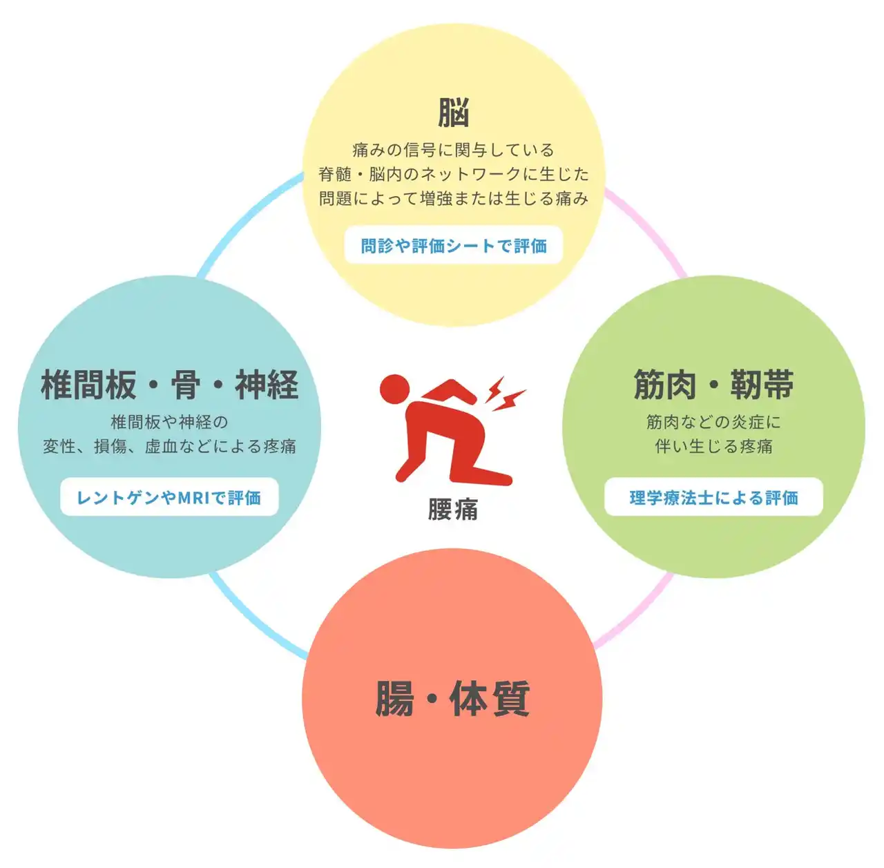 これらは単独ではなく、相互に影響し合いながら腰痛を悪化させる悪循環を形成していると推察されます。 |