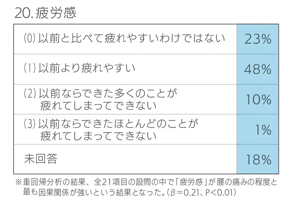 本調査結果は、脊柱管狭窄症・・椎間板ヘルニアなど腰痛疾患を抱える患者の治療において、身体的側面だけでなく、心理的・精神的側面への包括的なアプローチの重要性を示す調査結果となりました。疲労管理、精神的サポート、栄養指導、そして社会的活動の維持といった多面的な介入が、腰痛の軽減につながる可能性があります。 |