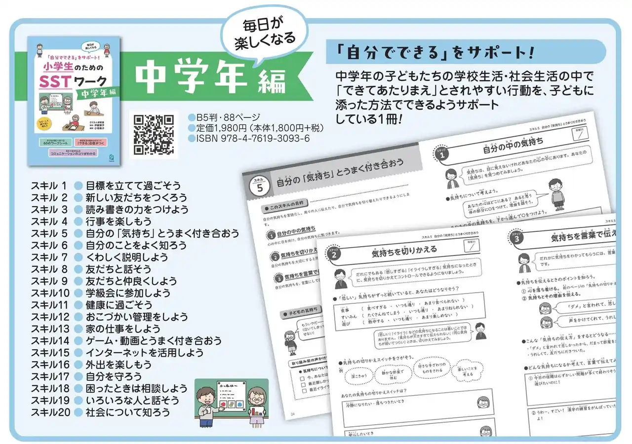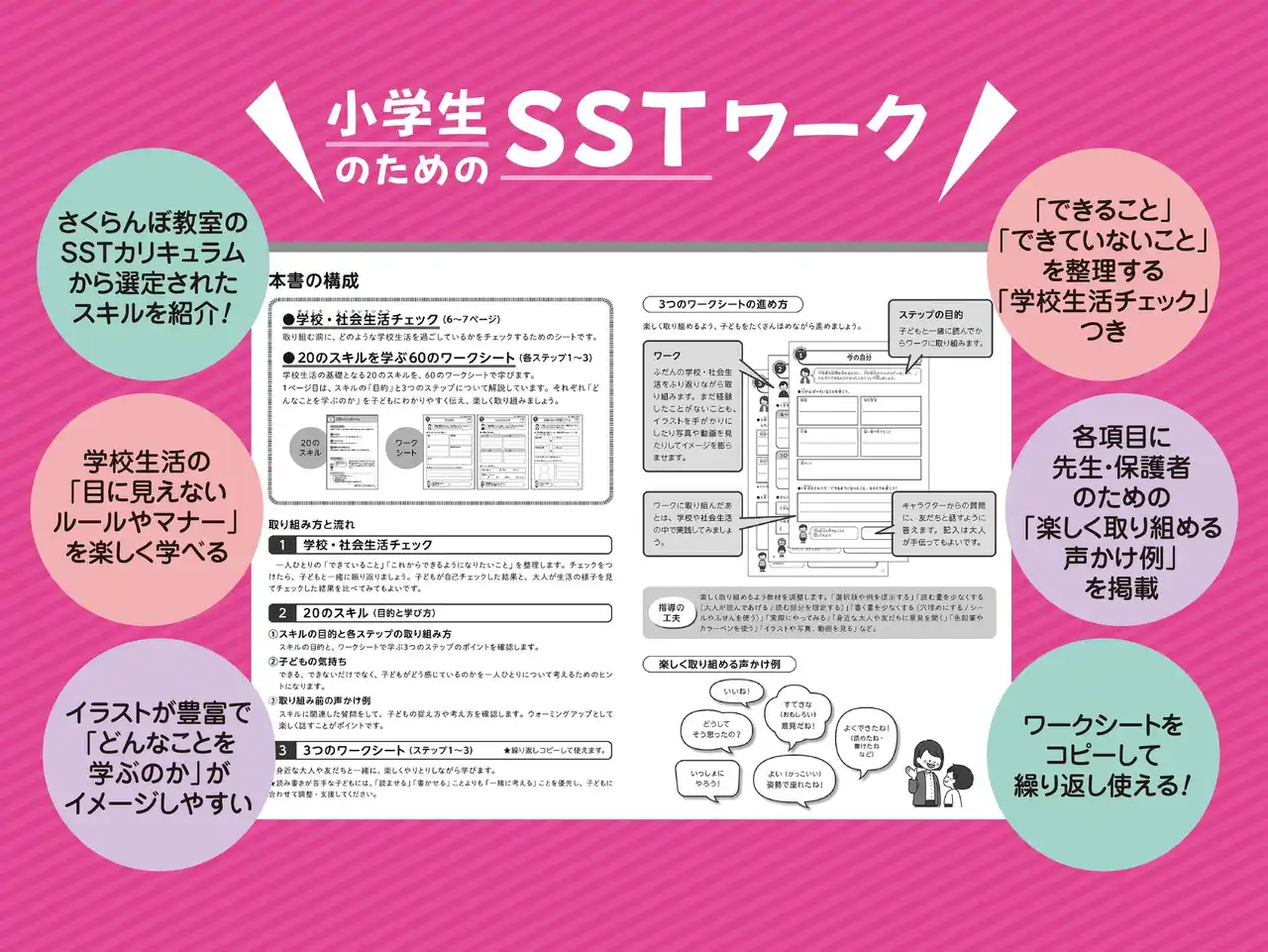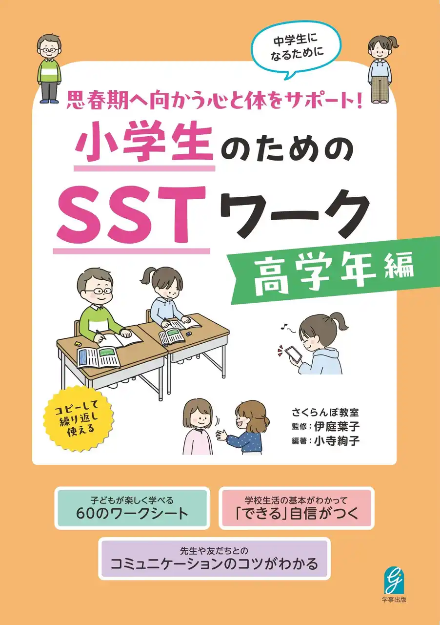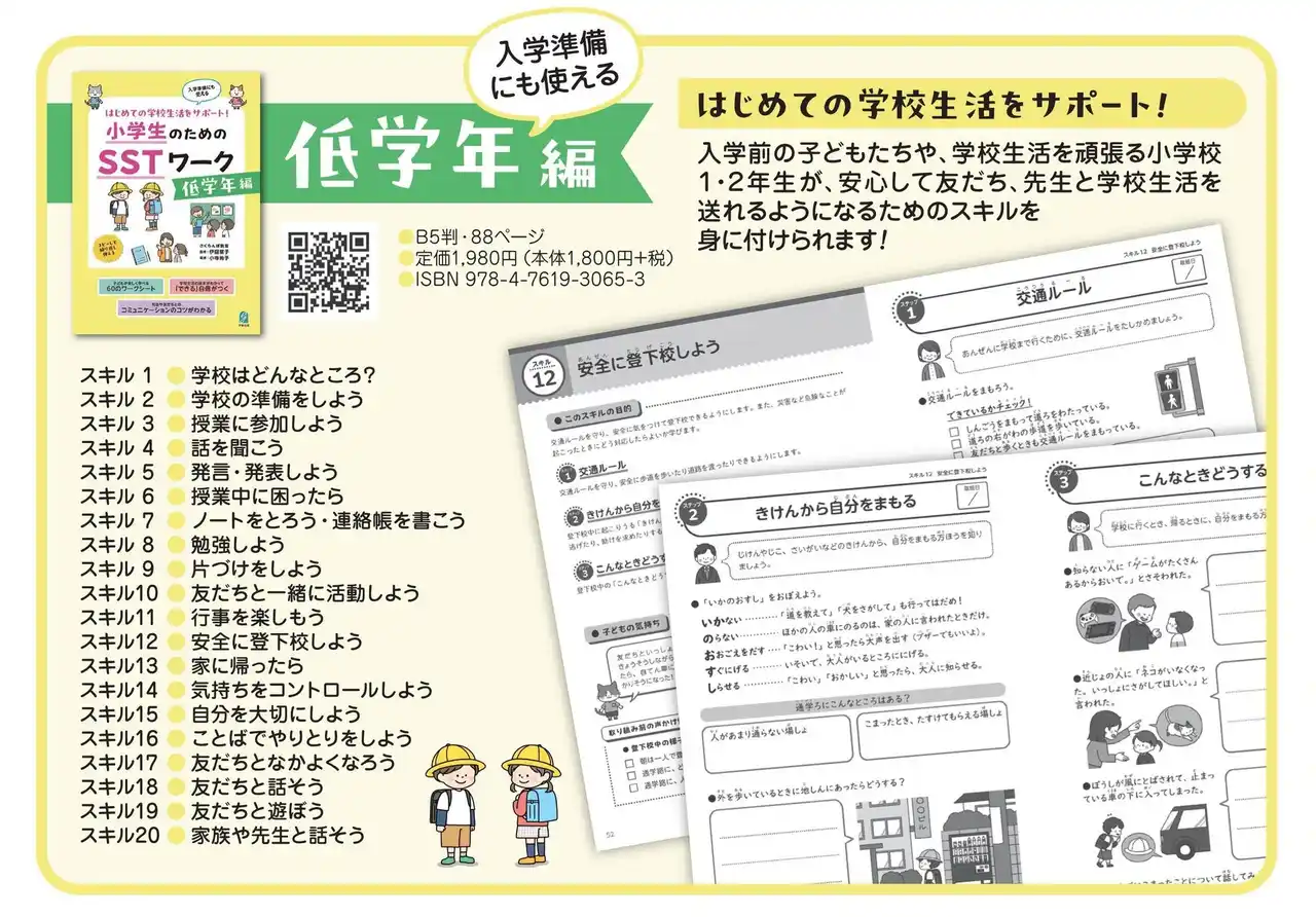 | 『中高生のためのSSTワーク』は、中学生・高校生へ向けたSSTのワークブックとして現在まで多くの学校・先生方にご好評をいただいております。今年6月には入学して間もない児童のほか、入学前の準備段階にある児童にも楽しく学べる『小学生のためのSSTワーク 低学年編』を刊行いたしました。 | ||||||||||||||