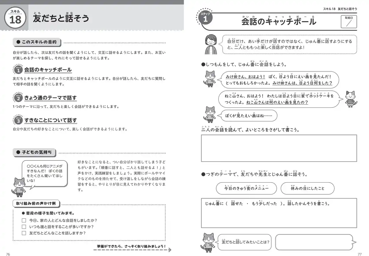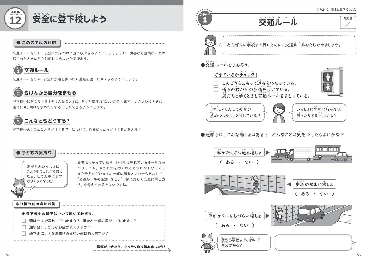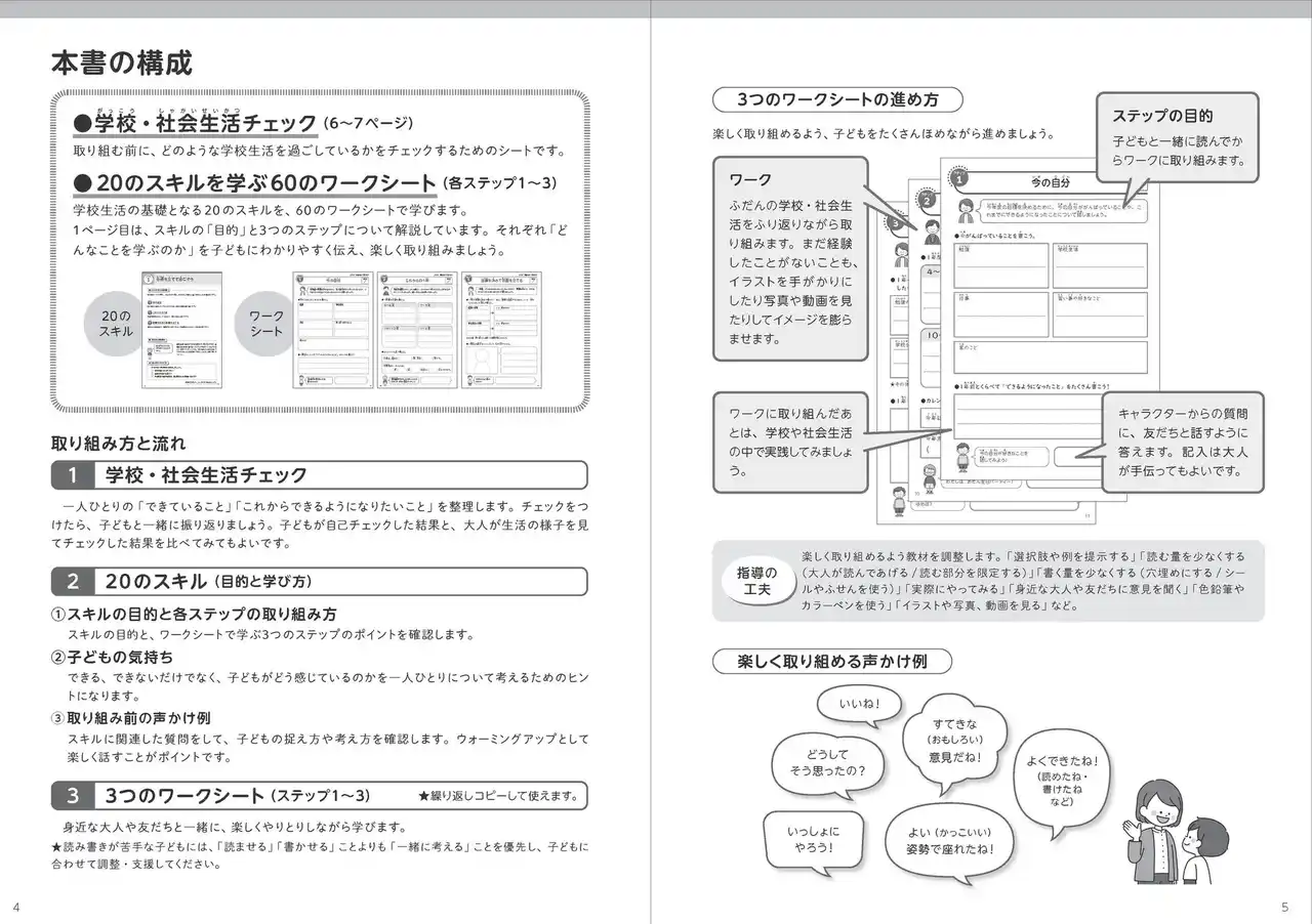 | 本書を取り組むにあたって、まずは子どもがどのような学校生活を送っているのかチェックシートで記録。その後、それをもとに学校生活の基礎となる20のスキルを、60のワークシートを用い、学んでいきます。1ページ目には、スキルの「目的」と3つのステップについて解説しています。それぞれ「どんなことを学ぶのか」を子どもにわかりやすく伝え、楽しく取り組んでいくと良いでしょう。 | ||||||||||||||
