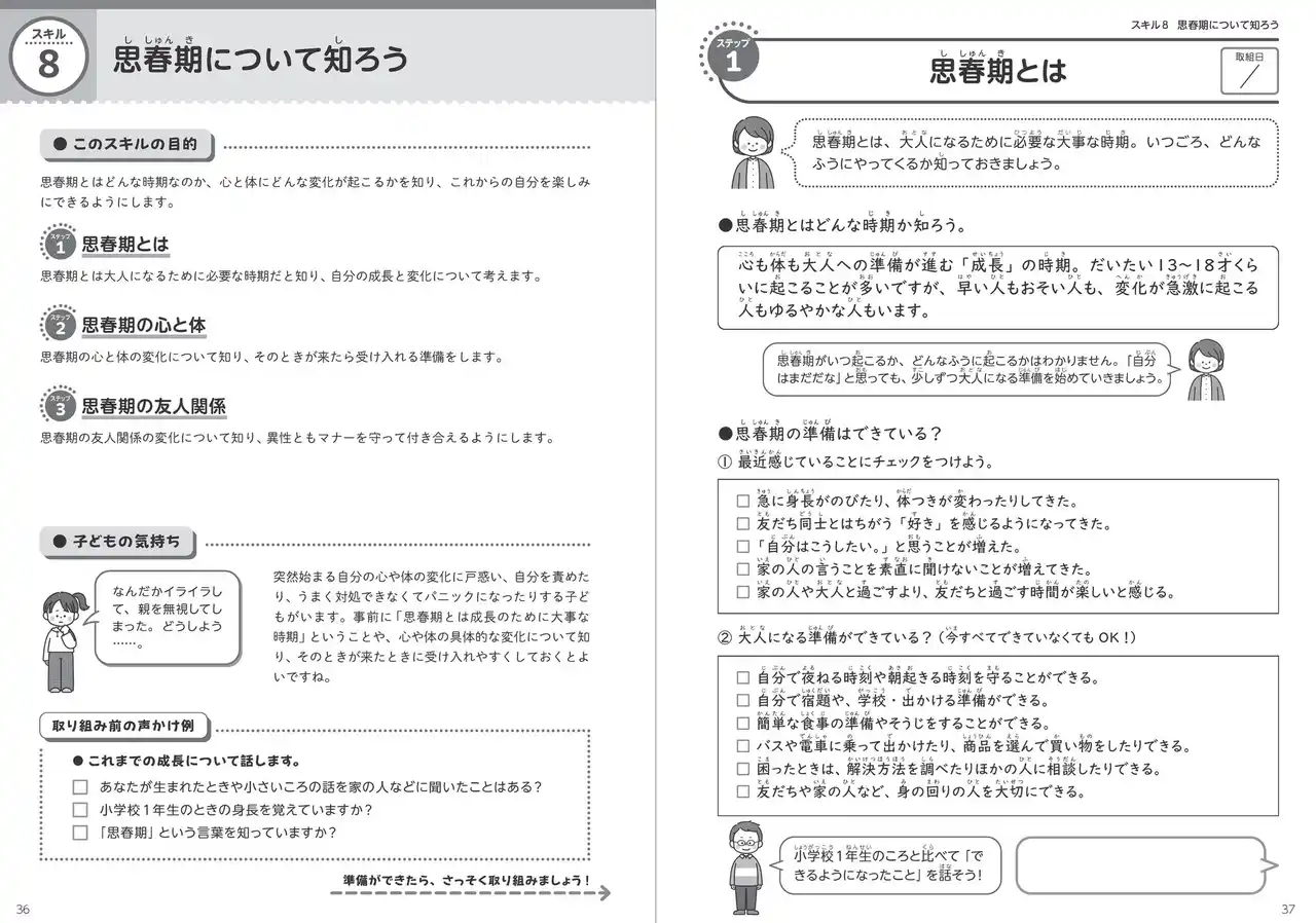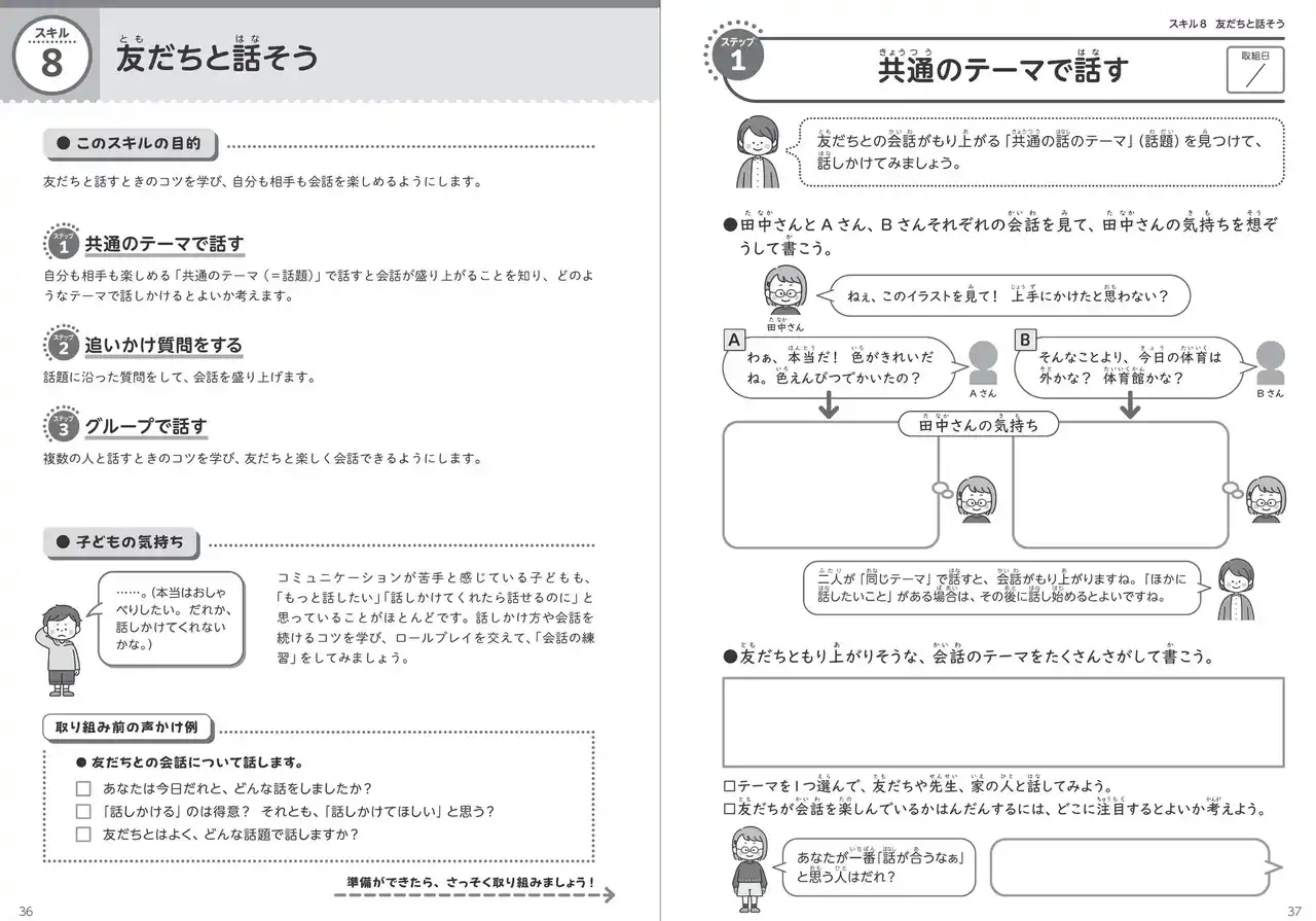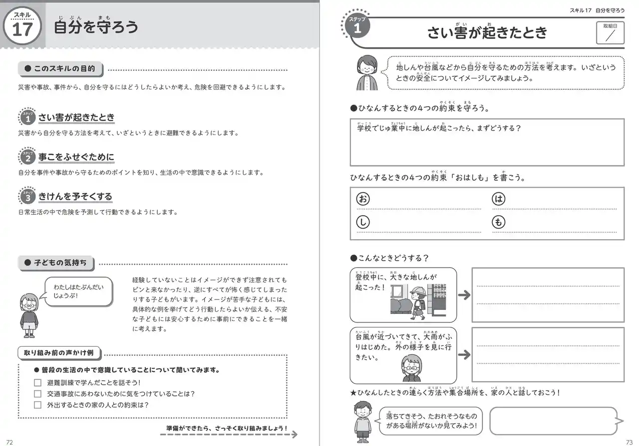 | 高学年で必要とされる「勉強の計画を立てる」「宿泊行事に参加する」「自分の意見を伝える」などの行動を、子どもができる方法を見つけ、実践できるよう構成されています! | ||||||||||||||