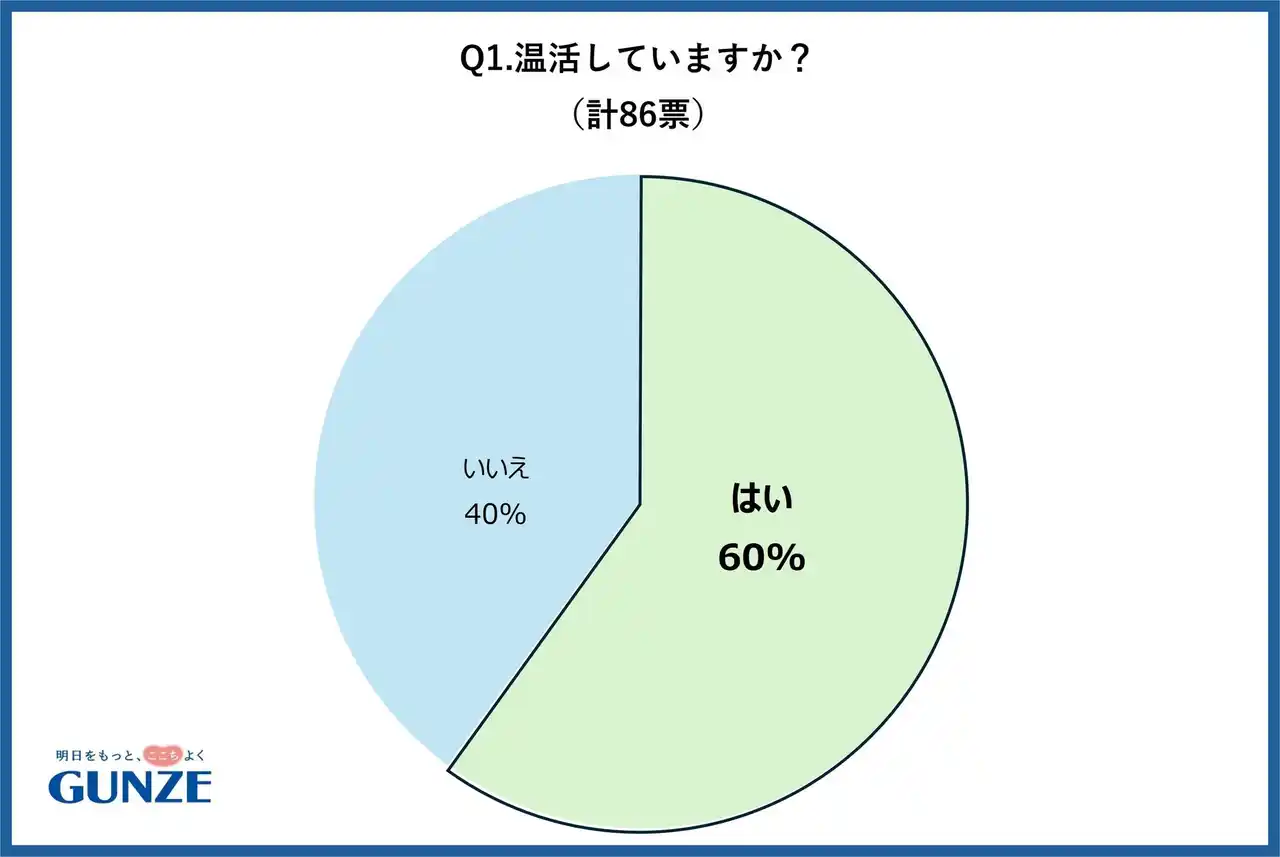 グンゼの公式Xを使用し、温活についてのアンケート調査を行いました。「温活をしている」と回答した人は60%、「温活で特に冷え対策をしている部分はどこですか?」という質問については、1位が「足先」で46%、2位が「お腹」で42%と足先に次いでお腹の冷えを気にしている方が多いことが分かりました。また、お腹の冷え対策として「腹巻を使ったことはありますか?」という質問については68%が使用したことがあると高い回答が得られました。※温活とは、衣類などで包み込んであたたかくすることです。 |