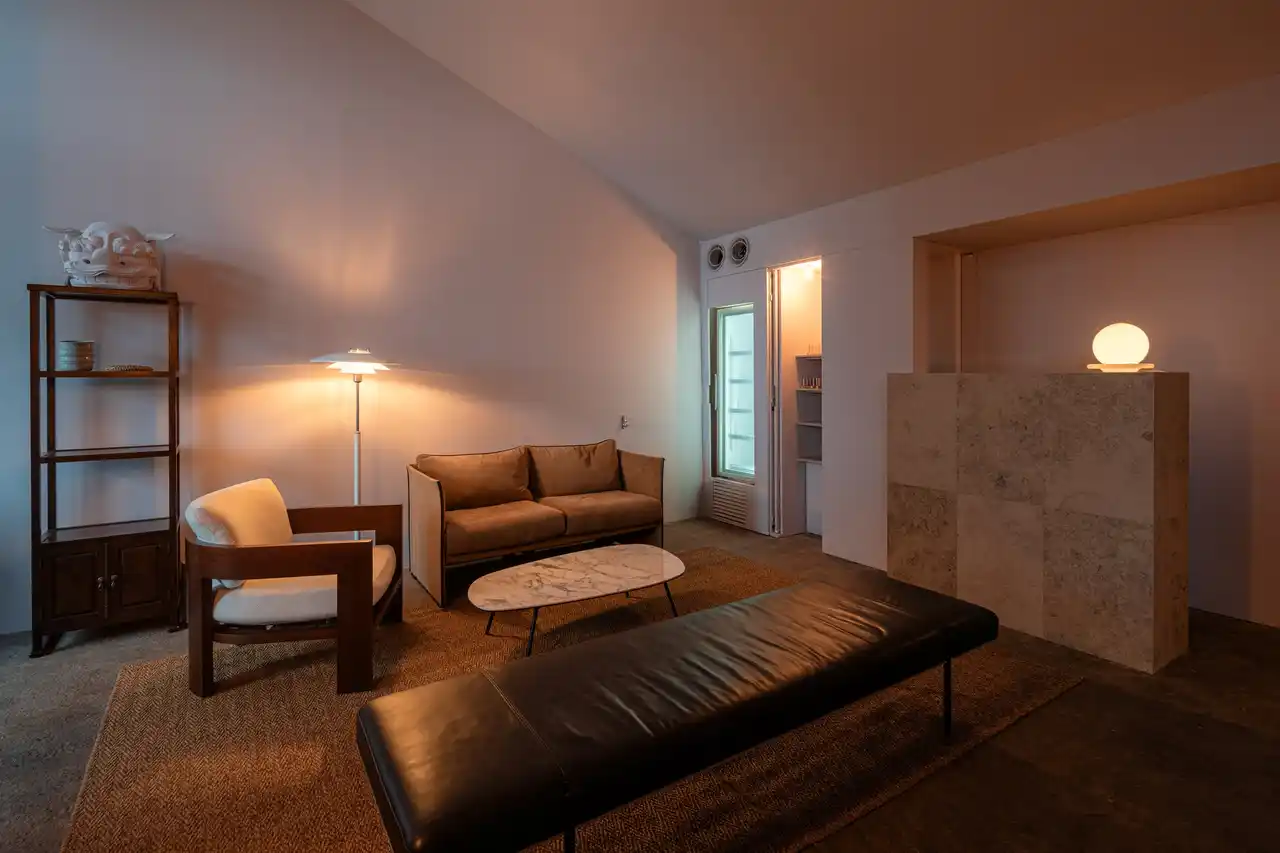 体が包み込まれるような心地よいソファに身をゆだね、光の移ろいとともに、時間帯によって変わる空間の表情をお楽しみください。 |
