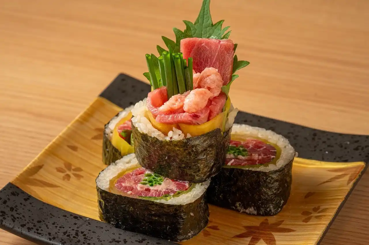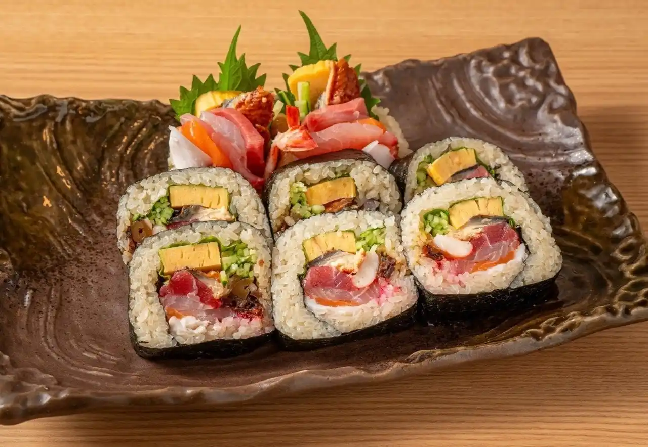 太巻きには12種類以上の具材を惜しみなく使い、断面の迫力と味の一体感を追求しました。まぐろ、白身、穴子、えび、玉子焼き、きゅうり、野菜など、多彩な素材が何層にも重なり、どこを食べても違う美味しさが広がります。にほんいち本町店を象徴する一本です。 |