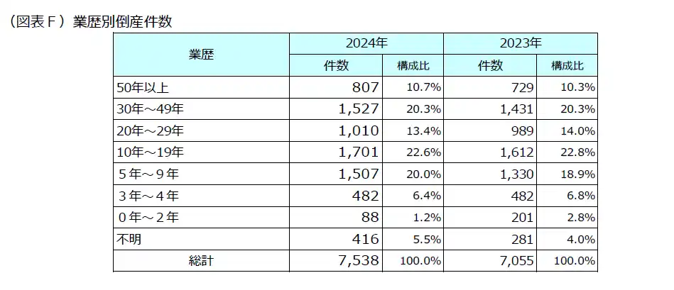 また、「50年以上」(同11.0%)の老舗企業では、10年単位での比較では最も倒産割合が低く、経営が安定している様子がうかがえます。(図表F) |