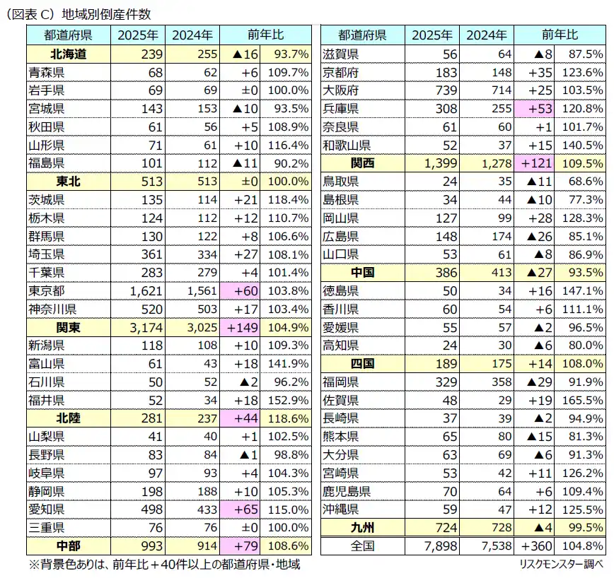 都道府県別では、29の都道府県において倒産件数が前年を上回りました。「愛知県」(498件 同+65件、115.0%)、「東京都」(1,561件 同+60件、103.8%)の件数増加や、「福井県」(52件 同+18件、152.9%)、「徳島県」(50件 同+16件、147.1%)の増加率の高さが目立っています。(図表C) |