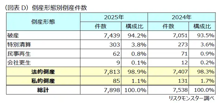 倒産形態別にみると、「法的倒産」がほとんどを占めています。手続きの種類は、「破産」(7,439件)が全体の94.2%を占め、「特別清算」(303件)を含めた場合、「清算型」倒産手続きが全体の98%となっています。一方、「民事再生」や「会社更生」の「再建型」倒産手続きは1%未満に留まっています。(図表D) |