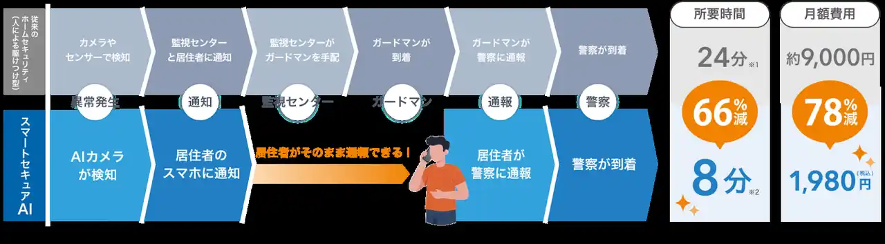 | 「スマートセキュア AI」は、ユーザー自身が、その場で判断・通報できるため、駆けつけサービスと比較して初動の対応スピードが早く、低コストでご利用が可能です。 | |||||||||||||||