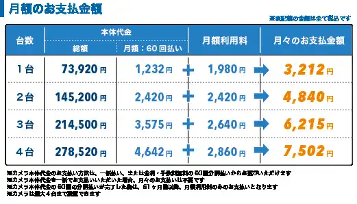 | 毎月のお支払いは月額利用料とカメラ本体代金の分割払い(60回)となります。なお、カメラ設置工事費用は別途となります。 | |||||||||||||||