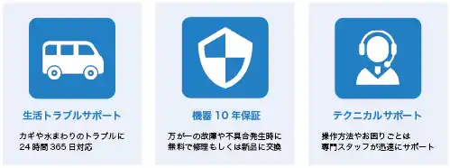 | 「スマートセキュア AI」には、利用に際してのお困りごとをサポートするヘルプデスクや、AIカメラ機器本体の10年保証および、水漏れなど日常生活のトラブルに関する緊急駆けつけサービス(24時間365日受付)が付帯されています。 | |||||||||||||||