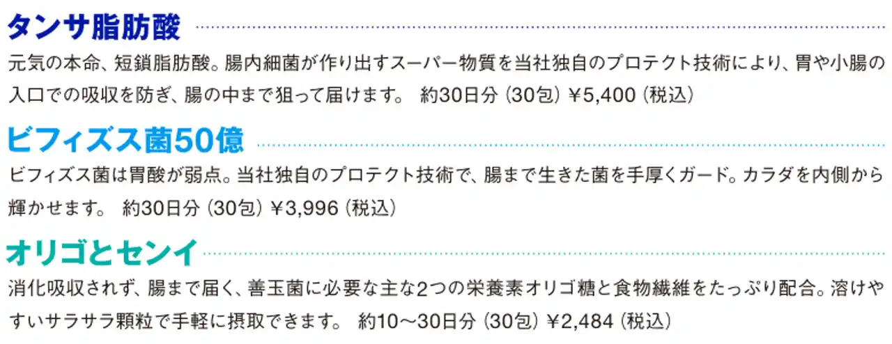 当社が発売した「タンサ脂肪酸」は、健康の最新トレンドとして大きな注目を集めているスーパー物質『短鎖脂肪酸』を、腸まで狙って届けることに成功した画期的な製品です。 |