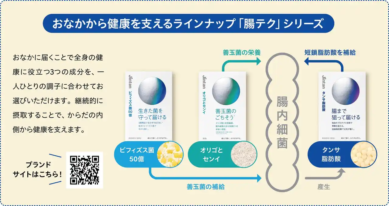 様々な「課題」を克服して届けるための技術を磨き、はずむように元気な日々を目指す方々のお役に立つ製品を開発したい。そんな願いを込めて、「タンサ脂肪酸」をはじめとする「腸テク」シリーズを開発しました。 |