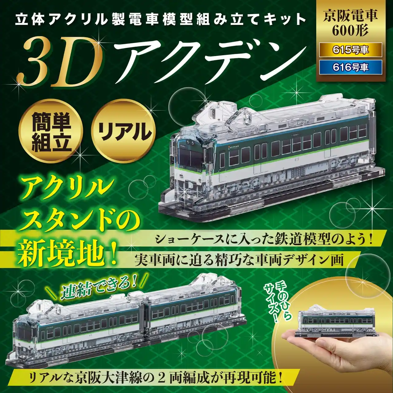 「3Dアクデン」はガラスより透明度が高いアクリル板に実車両を忠実に再現したCG画像をプリントし、複数のパーツを組み立てることで立体的な鉄道模型を完成させるキットです。従来のプラスチック模型や平面的なアクリルスタンドとは異なり窓辺やLEDライトの光が透過・反射してキラキラと輝くのが最大の特徴。まるで「アクリルケースの中に高級模型が入っている」ような美しい仕上がりで、走行させるのではなく「飾って楽しむ」新感覚のインテリア鉄道模型として注目を集めています。 |