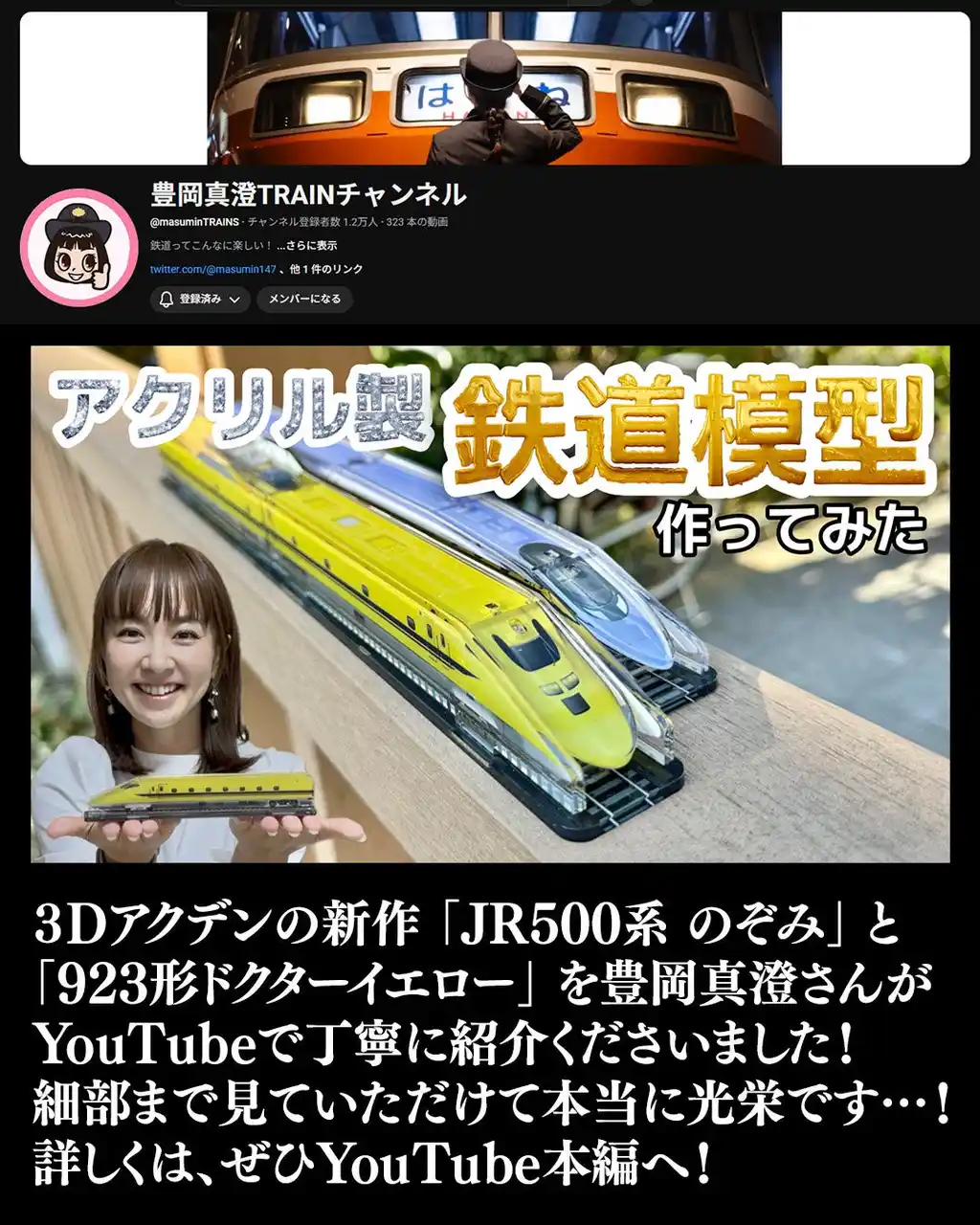 渡辺車輌工業株式会社(本社:大阪府寝屋川市 代表取締役:浅井輝明)は創業以来68年にわたり鉄道車両の清掃事業を通じて電車と深く関わってきた経験を活かし、日本初のアクリル製立体鉄道模型の組立てキット「3Dアクデン」を展開しております。2024年の発売以来、京阪電車シリーズが鉄道ファンから高い評価を得ており、近鉄「ひのとり」商品などを経てこの度JR新幹線「923形ドクターイエロー」、「500系のぞみ」の新商品を追加販売することになりました。年末ギフトシーズンに向け、さらなるラインナップの拡充を図ります。 |