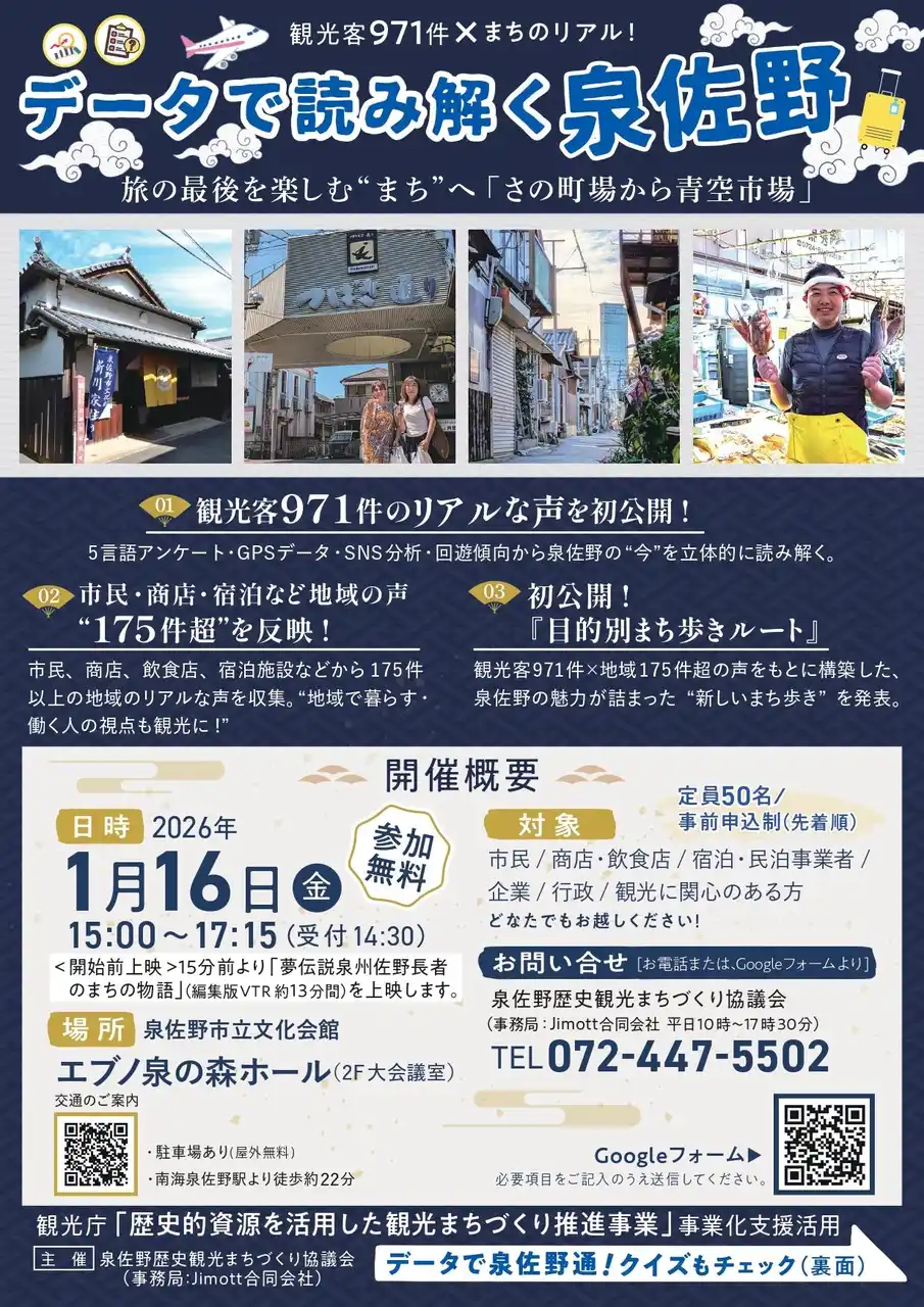 泉佐野歴史観光まちづくり協議会(事務局:Jimott合同会社)は、観光庁「歴史的資源を活用した観光まちづくり推進事業(事業化支援)」の一環として、 |