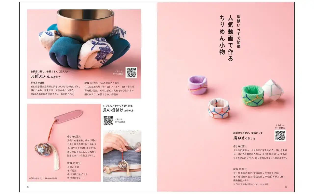 | 人気作品には、作り方動画を二次元コード付きで掲載しています。身近な材料で、ブローチやヘアアクセサリー、お守り袋など、素敵な小物を手作りできます。お友達やお孫さんへの贈り物にされる方も多いのです。伝承のデザインに発想を得た、最新作まで、バラティ豊かな作品が満載です。 | |||||||||||||