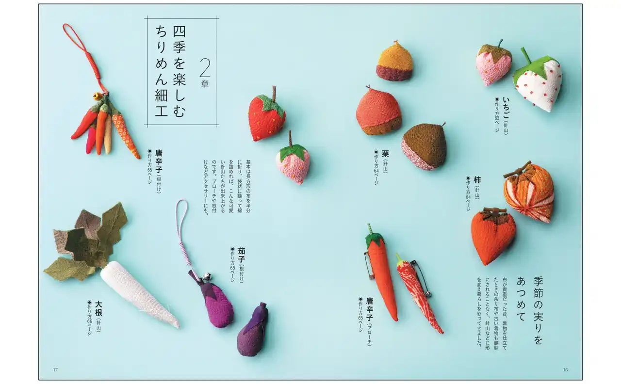 | 和の手芸の素晴らしさを伝えたい、そんな想いでちりめん細工作家としての活動を続けている著者・高橋よう子さん。本書は、高橋さんの厳選した人気作品に新作を加え、一冊にまとめました。伝統的な技を駆使した、可愛らしい作品ばかりです。 | |||||||||||||