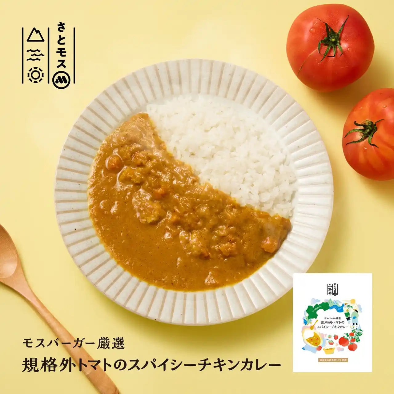 熊本県八代市産のトマトを使用した、トマトの風味豊かなチキンカレー。使用しているトマトは、味や風味は問題ないものの、熟れすぎたり、サイズが小さすぎるなどの理由で、モスバーガー店舗では使用できない規格外品です。 |