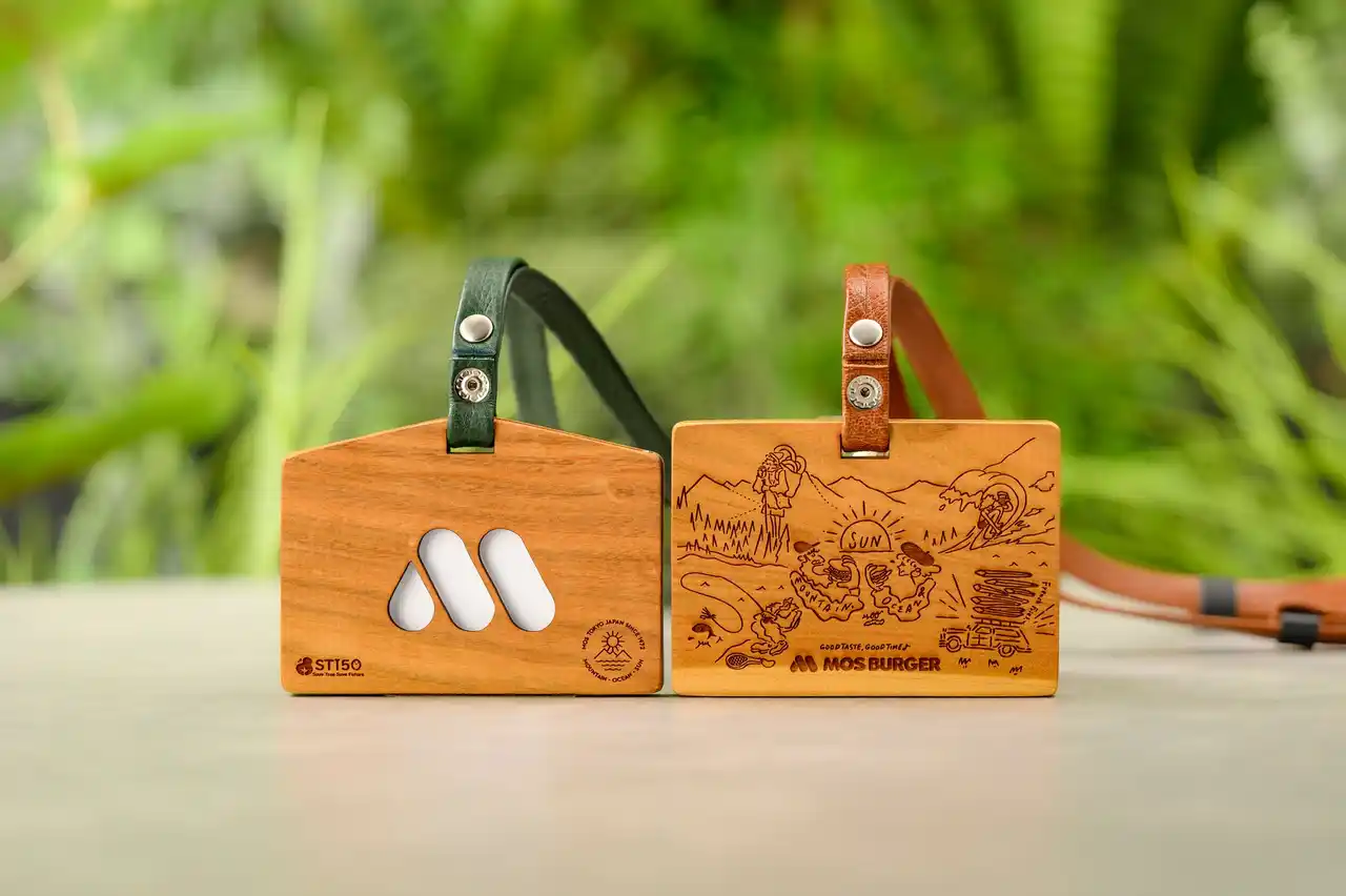 未利用間伐材の桜の木から作られたIDケースです。ストラップには、森林で害獣駆除された鹿の皮を使用しました。モスバーガーのロゴをデザインしたものと、「お手本は自然、選ぶのはあなた」をコンセプトにしたモス公式オンラインショップ「Life with MOS」をデザインしたものの2種類からお選びいただけます。なお、ロゴをデザインしたものは、ウッドデザイン賞2024を受賞しました。 |