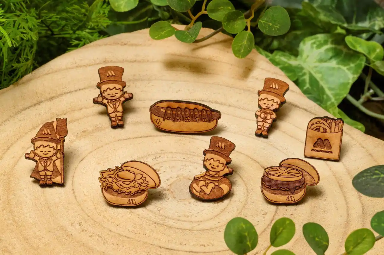 モスフードサービスのコーポレートキャラクター「リルモス」と、モスバーガーのハンバーガーなどをデザインした、未利用間伐材から作られたピンバッジです。リルモスのデザイン4種から1つを組み合わせた、4セットの中からお選びいただけます。 |