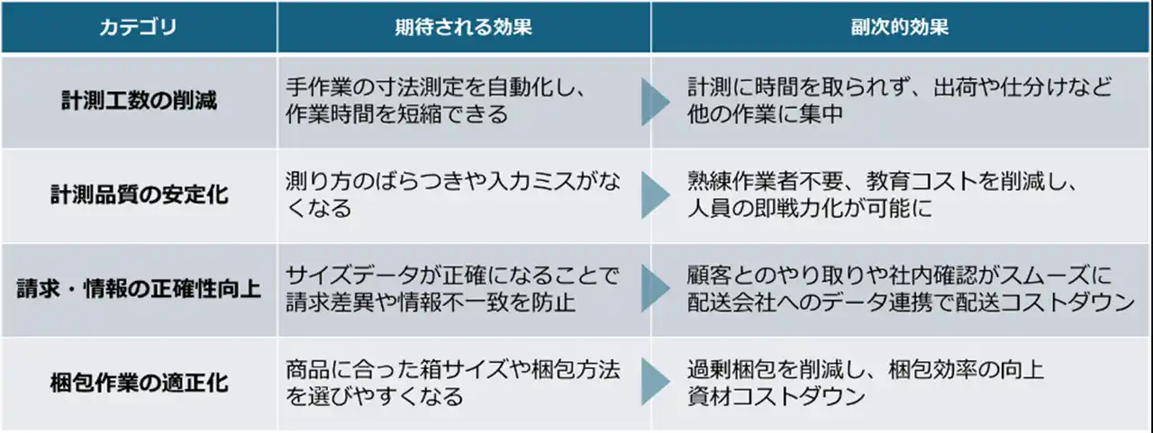 近年、Bin to Person型自動倉庫など自動化設備の導入が進み、取扱商品の寸法・重量データの整備ニーズが高まっています。入荷品のマスタ情報不足を現場で補完することで、入荷~保管・格納の設計に活かすことが可能となります。入荷工程で寸法・重量データが揃った商品マスタを整えることは出荷オペレーションにおける梱包資材の最適化や配送コストの低減にもつながり倉庫内作業全体の効率化とコスト削減を実現します。 |