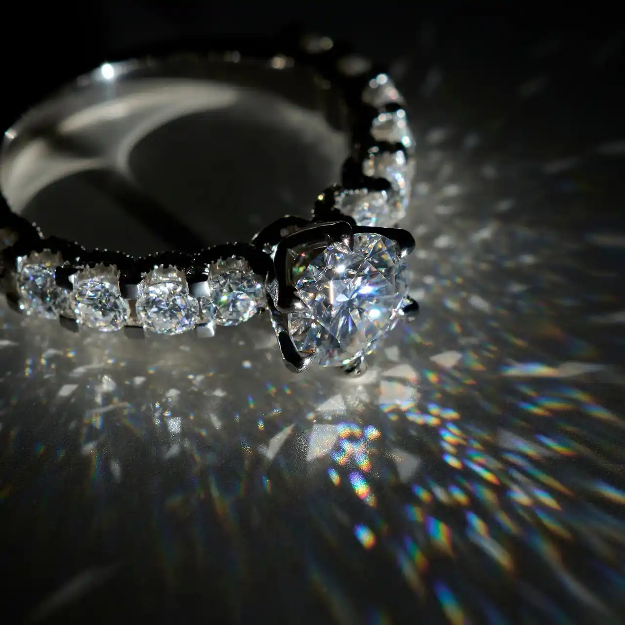 モアサナイトは、ダイヤモンドを超えるファイアと屈折率から「ダイヤモンドの約2.5倍輝く(*1)」とも言われる、眩い輝きが特徴の人工宝石です。 |