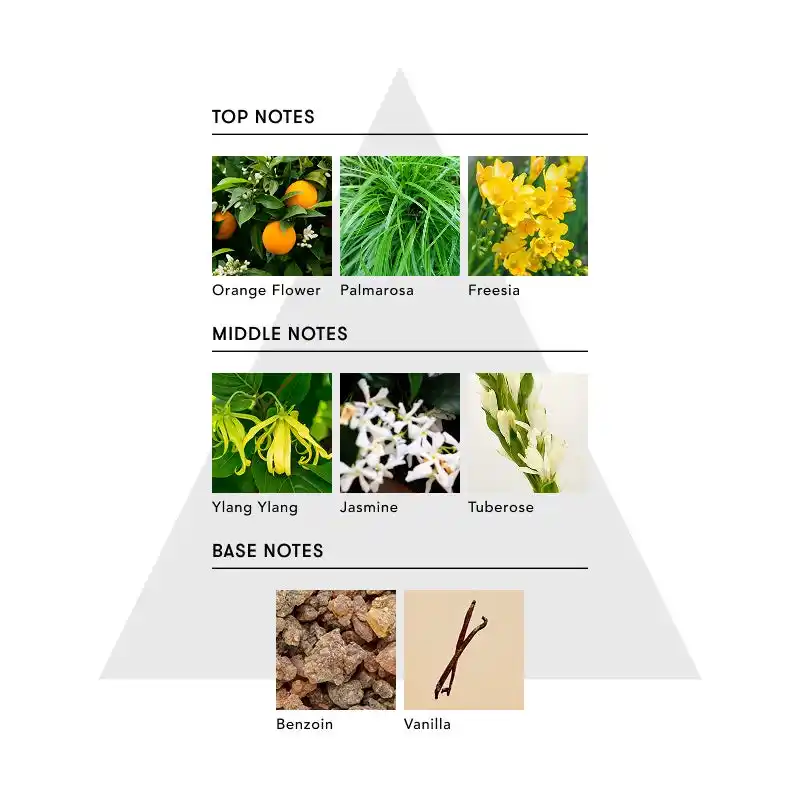 | ミドルノートに進むと、イランイラン、ジャスミン、チュベローズの華やかな芳香が深みを与えます。イランイランの官能的な香りとジャスミンの甘美さが融合し、チュベローズが優雅さを引き立てます。 | ||||||||||||||||