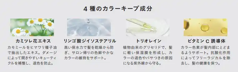 | 髪内部と外部、あらゆる角度からアプローチする成分を配合。色素の流出の原因となる紫外線ダメージや熱、乾燥を防ぎ、サロン後の美しい仕上がりをキープします。 | ||||||||||||||||