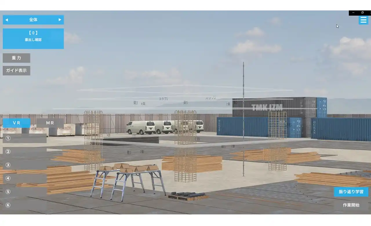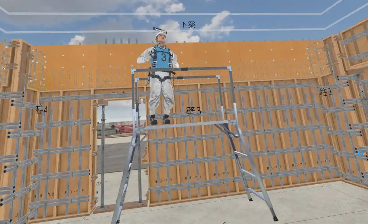重力切り替え機能: 重力を「オン」にすると、支保工を必要とする梁型枠の設置などで共同作業が必要となり、より実践的な訓練が可能です。 |