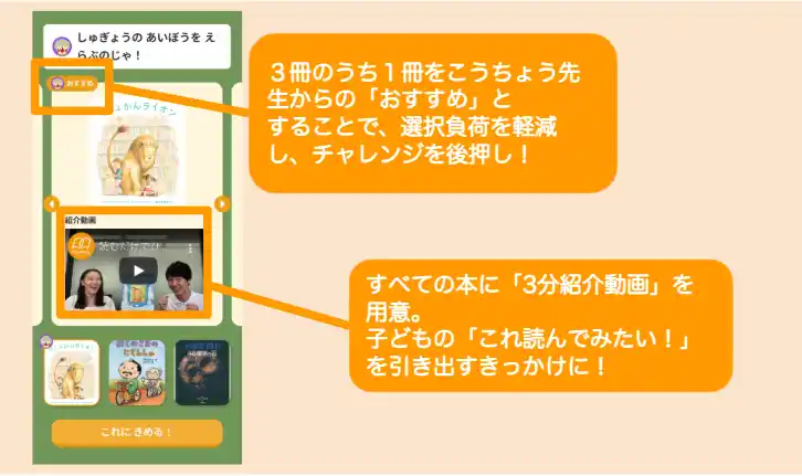 そこで、この2つの心理特性の最適なバランスを取るために、3冊のチャレンジ本の中でも「特におすすめの1冊」を提案することで、選択する前に離脱するリスクを減らし、子どもの主体性を高めながら、積極的にチャレンジできるようにアップデートしました。 また、すべての本には内容を約3分でまとめた紹介動画を用意しており、自ら「これを読みたい!」という気持ちから読書をスタートできるよう設計されています。 |