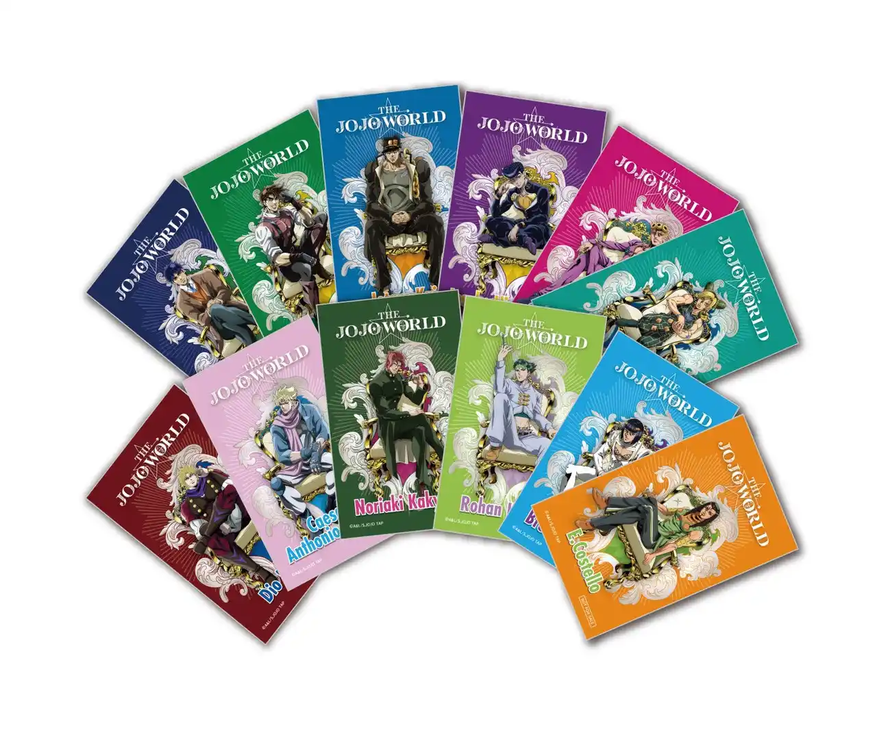 第2弾の新規アニメ描きおろし等身イラストでは、アニメ『ジョジョの奇妙な冒険』各シリーズの登場人物であるジョナサン・ジョースター、ウィル・A・ツェペリ、ジョセフ・ジョースター、シーザー・A・ツェペリ、空条承太郎(くうじょうじょうたろう)、ジャン・ピエール・ポルナレフ、東方仗助(ひがしかたじょうすけ)、虹村億泰(にじむらおくやす)、ジョルノ・ジョバァーナ、グイード・ミスタ、空条徐倫(くうじょうじょりーん)、ナルシソ・アナスイの全12人が登場します。