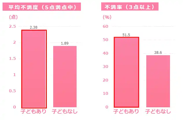 子どものいる人の平均不満度が2.38点、「不満3点以上」51.5%に対し、子どもがいない人は平均1.89点、「不満3点以上」38.6%と、育児期の負担が不満度を押し上げている可能性。 |